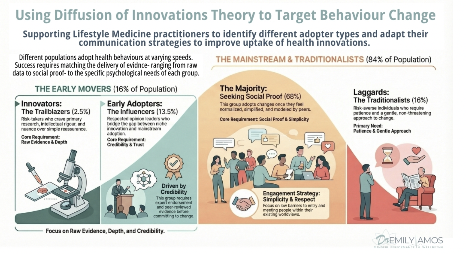 What the early majority needs: Social proof, practical guidance, and evidence that is delivered with warmth and relevance rather than clinical detachment. Community is a powerful motivator here. Consistency matters more than intensity, and pressure, however well-intentioned, tends to backfire.