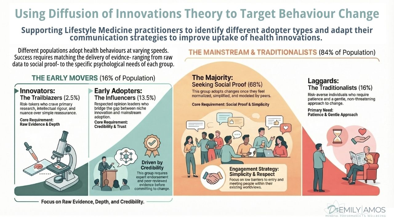 The late majority, also around 34%, tend to adopt new things largely because the social pressure to do so eventually outweighs the discomfort of changing. They are not stubborn, but they are cautious, and often for good reason. Many have encountered health trends or institutional changes that promised transformation and delivered very little. That history produces a healthy, if sometimes inconvenient, resistance to the new. The tipping point for this group is not enthusiasm. It is normalisation. When something stops feeling like a trend and starts feeling like a standard, they begin to engage. What works here is simplicity, and the lowest possible barrier to entry. Not a dramatic overhaul. A single, manageable, achievable step.